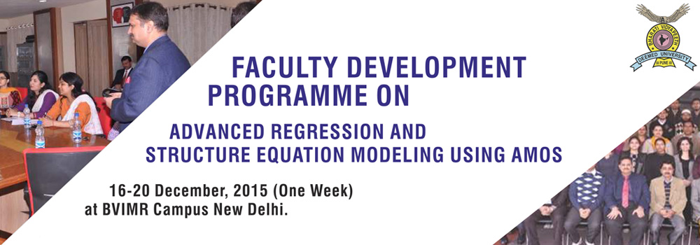 It is our pleasure to inform you that BVIMR, New Delhi is conducting Five Days *(One Week)* Faculty Development Programme on *Advanced Regression and Structure Equation Modeling (SEM) using AMOS on *December 16-20, 2015. The invitation cum detailed Brochure is attached for your reference. The resource persons for conducting the FDP are eminent professors from IIM and top business school of India. Faculty/scholars from outside NCR will be provided *free lodging* in the campus itself. Please note there are limited seats available and it will be served on first come first serve basis. Look forward to your participation. *The last date of FDP registration is 30th November 2015.*