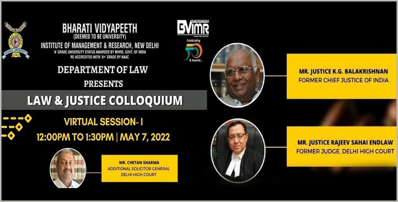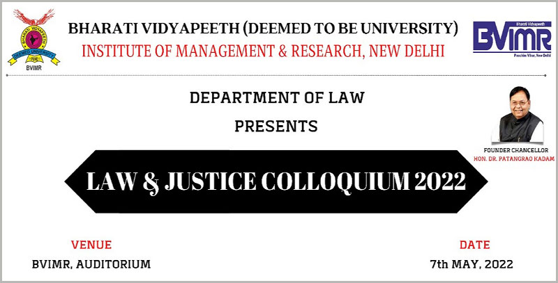 On 07th May 2022, The Law Department at the Institute of Management & Research, New Delhi, held a Colloquium on Law And Justice under the guidance of Dir. Yamini Agarwal, BVIMR, New Delhi, with arduous assistance from Coordinators Dr. Reena Gupta (HOD, Law Department), Mr. Shubham Mishra, and Ms. Yatika Gupta and various other faculty members. The program began with Lightening of the lamp by Chief Guest, Director, and Head of Department, Law Department followed through was Guru Vandana – Dance performance for a warm welcome by Janvi and Akriti. A Vote of Thanks was given by Dr. Reena Gupta, Head of Department, Law Department